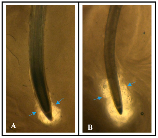 Increased mucilage production in “Solar”. The size of the mucilage layer (clear area denoted by blue arrows) from root tips of (A) conventional barley “Kopious” and (B) drought tolerant “Solar” is visualized using India ink, which cannot penetrate the mucilage surrounding border cells.