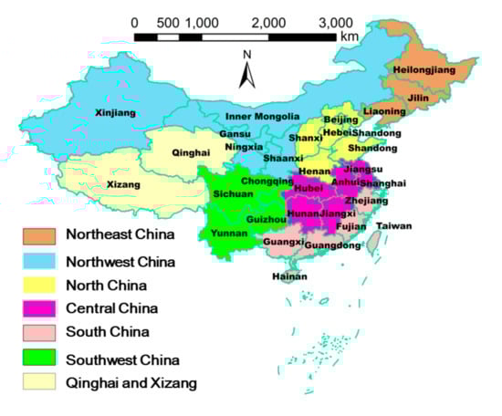 The study region was divided into northeast, northwest, north, central, south, and southwest China, and the combined Qinghai and Xizang region, based on the diverse geographic and climatic conditions (Figure 1 and Table 1). Rice is mainly distributed in central and south China which have a subtropical humid and sub-humid climate. Winter wheat is mainly distributed in northwest, north, and central China, and spring wheat is distributed mainly in northeast China. Maize is distributed in across a south-to-north transect from the low and middle latitudes in southwest China to the high latitudes in northeast China [19]. Spring maize is planted widely in northeast China (Heilongjiang, Jilin, and Liaoning province), southwest China (Yunnan, Guizhou, Chongqing, and Sichuan provinces, China), and in the Shanxi and Shaanxi provinces in the North China Plain. Summer maize is mainly distributed in the North China Plain (Hebei, Henan, Shandong, Beijing, and Tianjin provinces, China) [19].
