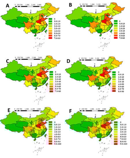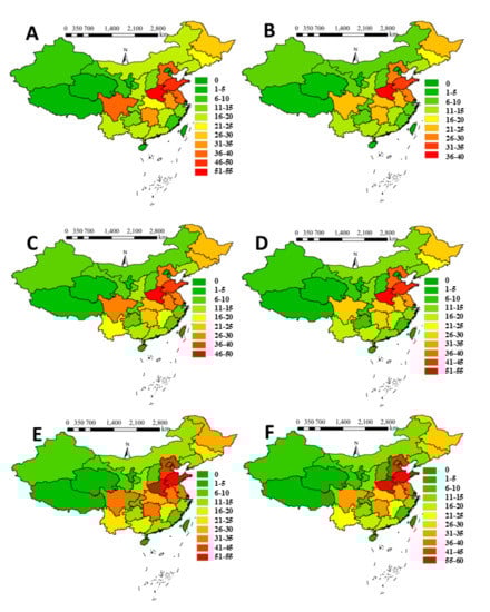 The spatial variation in the cereal cultivated area (M ha) in China from 1998 to 2016. Average cereal cultivated area from 1998–2001 (A), 2002–2004 (B), 2005–2007 (C), 2008–2010 (D), 2011–2013 (E), and 2014–2016 (F).