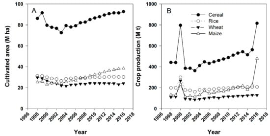 The cereal, rice, wheat, and maize cultivated area (A) and production (B) in China from 1998 to 2016.