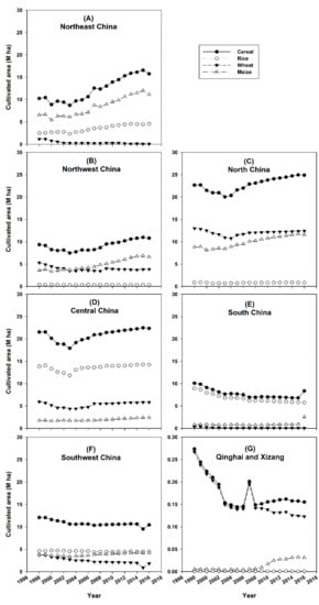 The spatial variation in the cereal, rice, wheat, and maize cultivated area (M ha) in northeast China (A), northwest China (B), north China (C), central China (D), south China (E), southwest China (F), and Qinghai and Xizang (G) from 1998 to 2016.