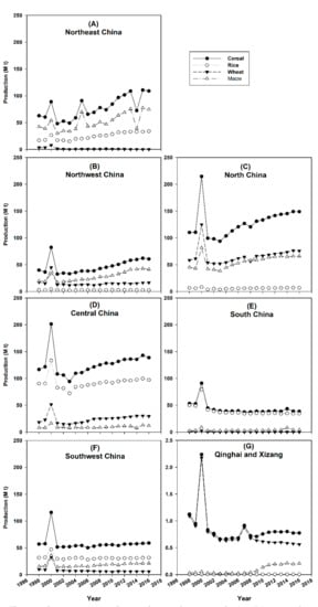 The spatial variation in cereal, rice, wheat, and maize production (M t) in northeast China (A), northwest China (B), north China (C), central China (D), south China (E), southwest China (F), and Qinghai and Xizang (G) from 1998 to 2016.