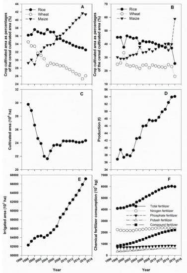 The variation in rice, wheat, and maize cultivated area (A) and production (B) as percentages of the cereal cultivated area or production, soybeans cultivated area (C) and production (D), irrigated area (E), and nitrogen, phosphate, potash, and compound fertilizer consumption, as well as total fertilizer consumption (F) in China from 1998 to 2016.