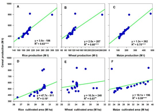 The cereal production was significantly and positively related to the production of rice (p < 0.0001), wheat (p < 0.0001), and maize (p < 0.0001) (Figure 8A–C), and there were significant positive relationships between cereal production and the rice cultivated area (p < 0.05), and maize cultivated area (p < 0.0001) (Figure 8D,F).