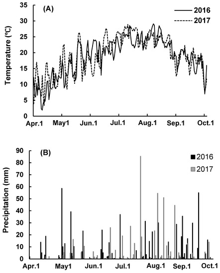 Daily temperature (A) and precipitation (B) during the maize-growing season in 2016 and 2017 at the experimental site.