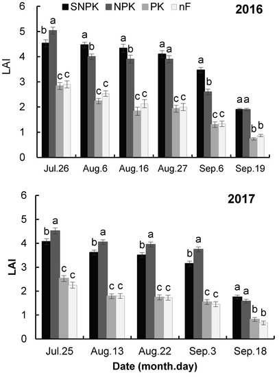 Leaf area index (LAI) post-flowering as effect of long-term fertilizer treatment SNPK, NPK, PK, and nF. SNPK represents combination of maize straw, chemical nitrogen, phosphorus, and potassium, NPK represents treatment of chemical nitrogen, phosphorus, and potassium, PK represents chemical phosphorus and potassium, and nF represents no fertilizer. Values with the same letter are not significantly different at p < 0.05, comparison within the same sampling date. Bars: Standard error of mean.