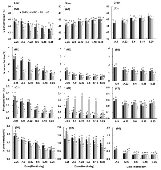 After flowering, total C concentration (%) decreased in leaf and increased in stem and grain, while N, P, and K concentrations decreased in leaf, stem, and grain (Figure 5). Total C concentrations (g plant−1) remained stable in leaf and stem after flowering; however, N, P, and K concentrations decreased with time in both leaf and stem (Figure 6). In grain, C, N, P, and K concentrations increased during the entire grain-filling period (Figure 6A3,B3,C3,D3).