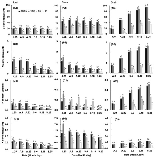 Total C, N, P, and K concentrations or contents in leaf, stem, and grain were similar in SNPK and NPK after flowering. In SNPK and NPK, these were higher than in PK and nF, especially for C and N content. PK had similar C and N content (Figure 6A1–A3,B1–B3) with the treatment of nF; however, had more P and K concentrations and contents in leaf and stem (Figure 5C1–C3,D1–D3; Figure 6C1–C3,D1–D3).