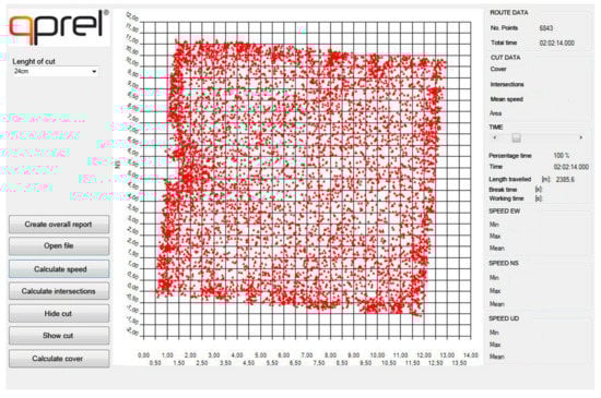 Once the position file had been opened, a preliminary data processing consisted in the selection of the position file points that were classified as being of acceptable quality. The software then excluded all points with a variance higher than 0.05 m on the reconstruction of the ENU coordinates, then the resulted accuracy was ± 0.05 m. Finally, the software only accepted the trajectories that travelled with a forward speed higher than 0.005 m s−1 and lower than 1.7 m s−1. After the preliminary phase, the software shows the coordinates of the robot mower on a scaled two-dimensional map (Figure 3). From the screen an operator can then select the area of interest on the map by manually designing a perimeter along the external coordinates of the robot mower (external red triangles in Figure 3). Once the area of interest has been selected, by setting the time and the length of the robot mower cut, and clicking on “Show cut”, the turfgrass cut area by the robot mower at a desired time is graphically shown on the screen (Figure 4). By clicking on “Hide cut”, the cut area is hidden. By clicking on “Calculate cover”, the percentage of cut is reported on the screen. At the same time the distance travelled by the robot is also shown (Figure 4). By clicking on “Calculate intersections” and “Calculated speed”, the number intersections of the robot mower trajectories and the mean forward speed were displayed (Figure 4).