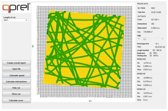 In addition to the cut area, the “Robot mower tracking data calculator” software processes the position file obtained with the RTKLIB software, and calculates every 5 s the mean forward speed of the robot mower, the intersections of the trajectories, the distance travelled, and the percentage area of the turfgrass cut. The software also shows other processed data such as the number of points recorded, total cutting time, and break and working time on the total cutting time.