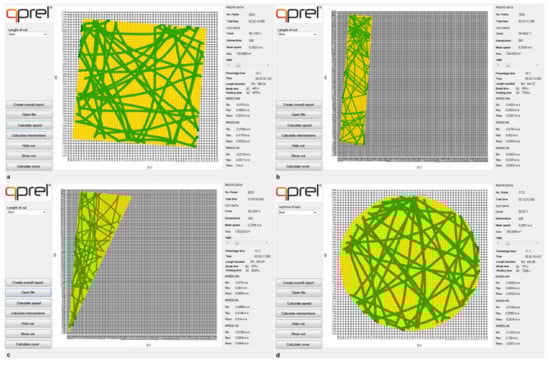 Screenshots of the software “Robot mower tracking data calculator” showing the different turfgrass area shapes with an area of 135 m2 selected (yellow area shapes): (a) Square, (b) rectangle, (c) triangle, and (d) circle. In these screenshots the percentage of cut area was 50% (green lines).