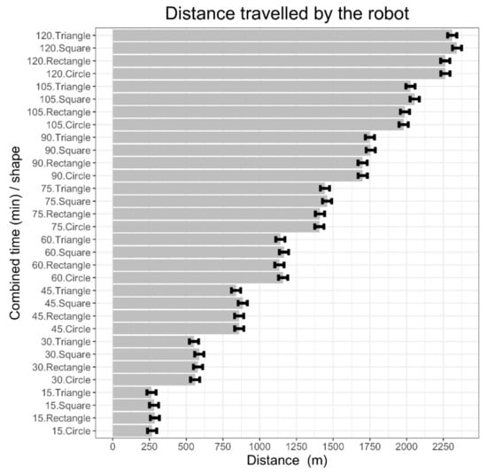 Means and 95% confidence intervals of the distance travelled by the robot mower in the four turfgrass areas (square, rectangle, triangle, and circle) at 15, 30, 45, 60, 75, 90, 105, and 120 min after the start of cutting.