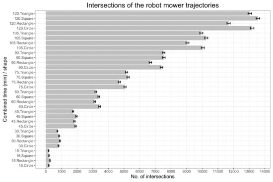 The intersections of the robot mower trajectories were related to the distance travelled and probably to where the turning occurred on the boundary of the shape. It was possible that in the rectangle the narrow and long shape enabled trajectories to be designed that from 0 min to 15 min of cutting had more crossing lines compared with other shapes, and from 75 min to 120 min had fewer crossing lines. In the square, the position of the turnings led to the highest number of crossed lines from 105 min to 120 min of cutting. The positions of the turnings in the circle and triangle shapes probably led to a similar number of crossed lines.