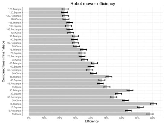The efficiency of the robot mower was affected by the interaction between the time and the shape of the turfgrass area (p-value < 0.001). Means and 95% confidence intervals are reported in Figure 9. After 15 min of cutting the efficiency of the robot mower in the triangle and circle was statistically similar, and significantly higher than in the square and rectangle. For this lapse of time, the robot mower showed the lowest efficiency in the rectangular shape. After 30 min of cutting, the robot mower efficiency was significantly different in all the shapes, with the highest value was found for the triangle (65% ± 1%), followed by the circle (62% ± 1%), square (58% ± 1%), and rectangle (55% ± 1%). After 45 min, the robot mower efficiency in the triangle and circle was again statistically similar. After this time, the efficiency in the square and rectangle was significantly similar, and lower than in the triangle and circle. After an hour of cutting, the efficiency in the triangle was higher than in the rectangle, but similar to the other shapes. On the other hand, the efficiency in the square, circle, and rectangle was significantly similar. After 75 min of cutting, the robot mower efficiency was significantly similar in all the shapes, which was maintained until two hours of cutting.