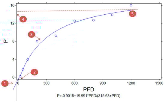Photosynthesis light response curves is non-linear and regression fitted. Red numbers: 1. Dark respiration rate (Rd), 2. Light compensation point (Ic), 3. Apparent quantum yield (φ), 4. Rate of photosynthesis at light saturation point (Amax), 5. Light saturation point.