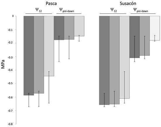 Environmental conditions at the two locations were also different in terms of the soil (Ψs) and atmospheric (Ψa) water potentials available to affecting the water potential of the plants. It was noteworthy that there were differences in water potential between locations, with 0.27 kPa in Susacón and 0.12 kPa in Pasca; and that water availability to the plants were most different for the two locations at mid-day (Table 1).