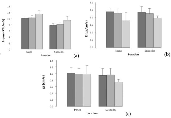 Average photosynthesis rate (A) (a), transpiration rate (E) (b) and stomatal conductance (gs) (c) for three groups of passion fruit (P. edulis f edulis) genotypes evaluated in this study: cultivars (dark gray bar), genebank accessions (medium gray bar), and landraces (light gray bar) grown across two environments, Pasca at 1800 m a.s.l. and Susacón at 2500 m a.s.l. Nested-ANOVA results at p < 0.005. The error bars indicate the standard deviation.