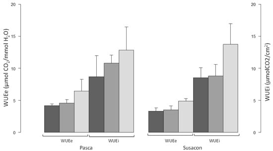 As for the ecophysiological parameters derived from light curves, we found that plants in Susacón responded efficiently to higher saturating solar radiation, which would explain the higher apparent quantum yield for this higher elevation location. The maximum photochemical efficiency of PSII are found when Fv/FM values are around 0.83 [9]. These are the values found in healthy plants, without any stress [27]. Average values for Fv/FM were quite similar for the two locations of Pasca and Susacón.