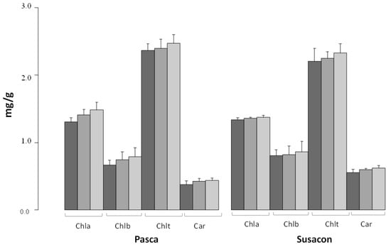 Chlorophyll content for chlorophyll a, chlorophyll b, total chlorophyll and carotenoids in 50 purple passion fruit genotypes grown across two environments, Pasca at 1800 m a.s.l. and Susacón at 2500 m a.s.l. The genotypes were grouped according to their origins as: commercial cultivars (n = 8, dark gray bar), genebank accession (n = 8, medium gray bar), and landraces (n = 34, light gray bar). Error bars indicate the standard deviation.