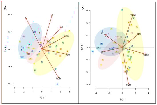 Principal component analysis showing cumulative variance explained (in parenthesis) for the 50 purple passion fruit genotypes in A. Pasca (1800 m.a.s.l); with first and second components PC1(45%) and PC2(32%). B. Susacón (2500 m.a.s.l) with first and second components PC1 (53%) and PC2 (33%). The blue shaded circle defines genebank accessions; the red circle defines commercial cultivars; and the yellow circle defines landraces. Abbreviations for vector lines are: E = Transpiration rate, Amax = Maximum photosynthesis, PARsat = photosynthetically active radiation, Carot = carotenoids, WUEe = extrinsic water use efficiency, VPD = vapor pressure deficit, ψ12 = day leaf water potential.