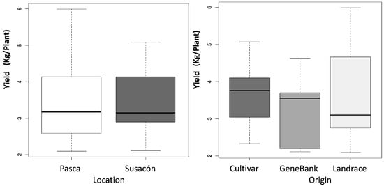 Yields were similar across sites (p-value > 0.05). However, we observed highly significant differences (p-value < 0.001) between and within the groups of genotypes (Figure 7). The commercial cultivars and genebank accessions had better average yields in comparison to the landraces. However, we observed that there were genotypes within the latter group that exhibited much better yields than genotypes of the other two groups.