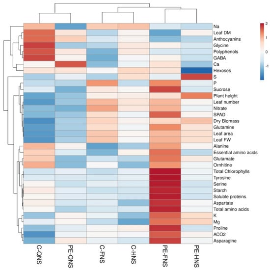 The aggregated data heat-map analysis (Figure 1) identified two main clusters corresponding to the quarter-strength NS (QNS) on the left and the other two nutrient solution concentrations (full- and half-strength) on the right. This indicates that the strength/concentration of the nutrient solution was the main clustering factor responsible for different effects in dependence on its own concentration (i.e., QNS vs. HNS and FNS%). Two separated sub-clusters could be defined under the second cluster, which illustrated the NS × PE interaction. The PE Auxym® biostimulant at full- and half-strength NS (PE-FNS and PE-HNS, respectively) treatment sub-clusters separated from the control treatment at full- and half- strength NS (C-FNS and C-HNS, respectively) treatments because of their higher plant height, leaf area, and fresh weight, and glutamine and glutamate content. In particular, PE-FNS showed the highest free amino acids, soluble proteins, and total chlorophylls concentration, as well as starch and sucrose. The control treatment at quarter-strength NS (C-QNS) was distanced from all other treatments mainly because of its higher GABA, polyphenols, glycine, anthocyanins, and leaf dry matter. The PE Auxym® treatment at quarter-strength NS (PE-QNS) was characterized by lower total amino acids, carbohydrate, and nitrate contents, but higher asparagine and glutamine concentration compared to C-QNS, with better crop performance (higher fresh and dry biomass) and nutritional status (higher K and Mg and lower Na content), and was able to maintain higher photosynthetic activity (Figure 1).