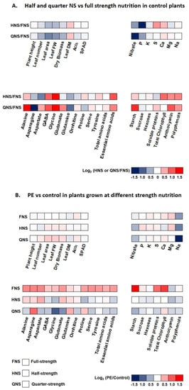 Heat map analysis summarizing the plant response to different nutrient solution (NS) concentrations (full-strength (FNS), half-strength (HNS), and quarter-strength (QNS), and tropical plant extract (PE) biostimulant). Results were calculated as Logarithm base 2 (Log2) of HNS and QNS/FNS in (A) control plants or (B) PE/control in plants grown at different NS, and are visualized using a false color scale with red indicating an increase and blue a decrease. White squares denotes no differences.