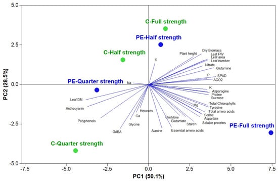 Principal component loading plot and scores of principal component analysis (PCA) of growth parameters, fresh yield, and shoot dry biomass mineral concentrations (nitrate, P, K, Ca, Mg, S, and Na), net CO2 assimilation rate (ACO2), SPAD index, chlorophyll, starch, soluble carbohydrates, soluble proteins, amino acids profile, and total amino acids in untreated (C) and treated Corchorus olitorius plants with tropical plant extract (PE) biostimulant grown under different nutrient solution concentration (full-, half-, and quarter-strength: 100%, 50%, and 25%, respectively).