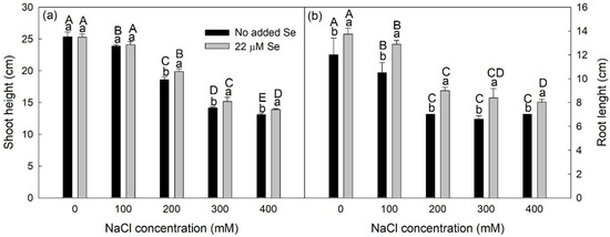 Means ± SD (n = 5) of the shoot height (a) and root length (b) of untreated seedlings (No added Se) and Se-treated seedlings (22 μM Se) under different NaCl concentrations. Values followed by different letters statistically significantly differ at p < 0.05. Means with different lowercase letters significantly differ by a t-test between Se treatments (No added Se and 22 μM Se) at the same NaCl concentration. Means with different capital letters significantly differ by an LSD test under different NaCl concentrations in separate untreated and Se-treated groups (p < 0.05).