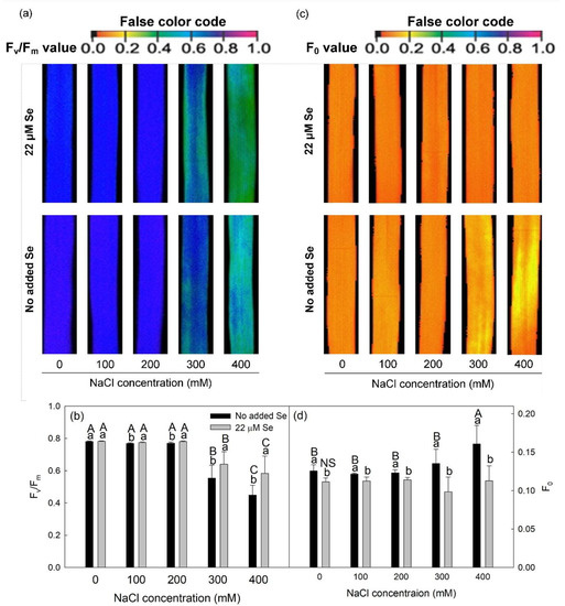 Images and the mean ± SD (n = 4) of the maximum quantum yield of photosynthetic system II (Fv/Fm) (a,b) and the minimal fluorescence of photosynthetic system II (F0) (c,d) of leaves collected from untreated seedlings (No added Se) and Se-treated seedlings (22 μM Se) under different NaCl concentrations. The false color code depicted on the top of the images ranges from 0.0 (black) to 1.0 (purple). Values followed by different letters statistically significantly differ at p < 0.05. Means with different lowercase letters significantly differ by a t-test between Se treatments (No added Se and 22 μM Se) at the same NaCl concentration. Means with different capital letters significantly differ by an LSD test under different NaCl concentrations in separate untreated and Se-treated groups (p < 0.05).