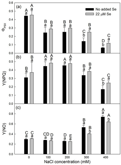 Means ± SD (n = 4) of the effective quantum yield of photosystem II under illumination (ΦPSII) (a), quantum yield of regulated energy dissipation of photosystem II (Y(NPQ)) (b), and the quantum yield of non-regulated energy dissipation of photosystem II (Y(NO)) (c) of leaves collected from untreated seedlings (No added Se) and Se-treated seedlings (22 μM Se) under different NaCl concentrations. Values followed by different letters statistically significantly differ at p < 0.05. Means with different lowercase letters significantly differ by a t-test between Se treatments (No added Se and 22 μM Se) at the same NaCl concentration. Means with different capital letters significantly differ by an LSD test under the different NaCl concentrations in separate untreated and Se-treated groups (p < 0.05).