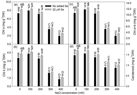 Means ± SD (n = 3) of chlorophyll (Chl) a (a), Chl b (b), Chl a+b (c), and carotenoids (d) of leaves collected from untreated seedlings (No added Se) and Se-treated seedlings (22 μM Se) under different NaCl concentrations. Values followed by different letters statistically significantly differ at p < 0.05. Means with different lowercase letters significantly differ by a t-test between Se treatments (No added Se and 22 μM Se) at the same NaCl concentration. Means with different capital letters significantly differ by an LSD test under different NaCl concentrations in the untreated and Se-treated groups (p < 0.05). The concentration of Se treatment was 22 μM.