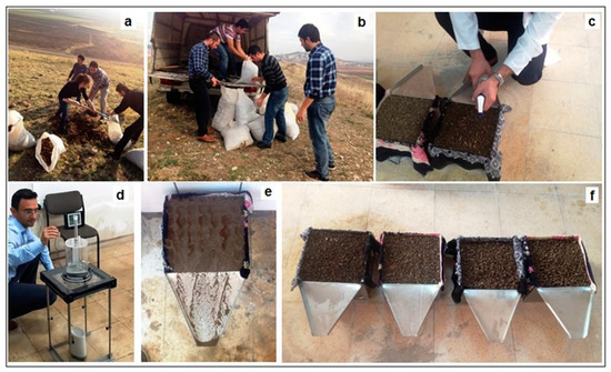 Rainfall simulation experiments were conducted on laboratory erosion plots (pans: 25 × 25 × 15 cm of width, length, and depth, respectively) by using a mini-rainfall simulator (Figure 1d; Product Code: M1.09.06.E, type LUW, Eijkelkamp Agrisearch Equipment, which was mass-produced by Eijkelkamp firm (Eijkelkamp Soil & Water, Giesbeek, The Netherlands). The mini-rainfall simulator consists of a watering unit with 49 drop formers and a 2300 mL capacity water load unit, which is achieved basically by a Mariotte scheme that regulates the pressure in its reservoir. The drop-forming caps have a length of 10 ± 1 mm and an inner diameter of 0.6 ± 0.08 mm. Sprinkling is effective on a plot of 0.0625 m2 (Figure 1e). The drop distance of the droppers is 0.4 m.