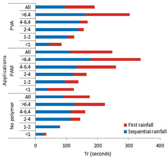 Time to runoff generation results per aggregate sizes. PAM: Polyacrylamide; PVA: Polyvinyl alcohol; Tr: Time to runoff.