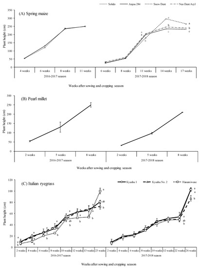 Changes in plant height in spring maize (A), pearl millet (B) and twice-cut Italian ryegrass (C) in two cropping seasons. Values show mean ± standard error (n = 3). a–c p < 0.05 among cultivars in the same cropping season and system.
