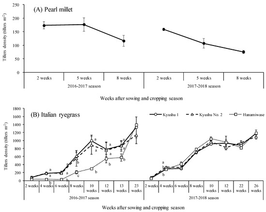 Changes in tiller density in pearl millet (A) and twice-cut Italian ryegrass (B) in two cropping seasons. Values show mean ± standard error (n = 3). a–c p < 0.05 among cultivars in the same cropping season and date.