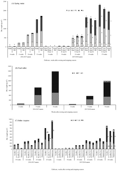 Changes in dry weight of plant fractions in spring maize (A), pearl millet (B) and twice-cut Italian ryegrass (C) in two cropping seasons. Plant fraction: Leaf blade (LB), Stem inclusive of leaf sheath (ST), Ear (E), Tassel (T) and Dead leaf (D). a–c p < 0.05 among cultivars in the same cropping season and date.