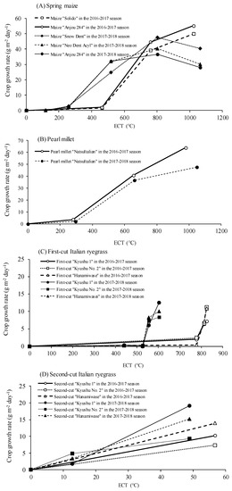 Changes in crop growth rate against effective cumulative temperature (ECT) in spring maize (A), pearl millet (B), and twice-cut Italian ryegrass (C,D) in two cropping seasons.