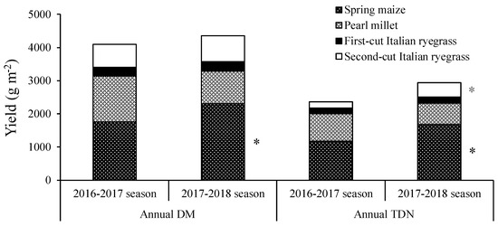 Annual dry matter (DM) and total digestible nutrient (TDN) yields of the triple-cropping system in the 2016–2017 and 2017–2018 seasons. *, p < 0.05.