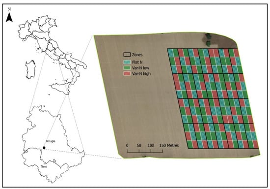 Geographical location of the study area and experimental layout. Flat-N (standard rate of 120 kg N ha−1), Var-N-low (variable rate from 60 to 120 kg N ha−1), Var-N-high (variable rate from 90 to 150 kg N ha−1).