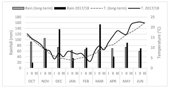 Monthly cumulated rainfall and average temperatures per decade during the wheat growing season 2017–2018 and in the long term (temperature 1951–2018, rainfall 1921–2018).