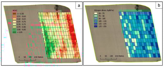 (a) NDVI calculated from Level 2A Sentinel-2 image collected on 22 March 2018; (b) Prescription N map developed by integrating the three different experimental treatments.
