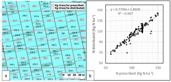 (a) Comparison between prescription map and the distributed Sulky output. (b) Scatter plot between the prescribed and distributed rate within each plot.