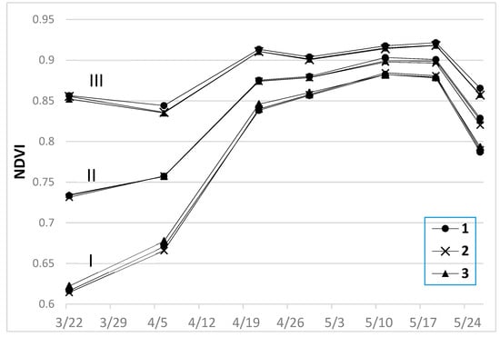 NDVI time series analysis, considering the three vigor classes as identified in the S2 image of March 22nd (I: NDVI ≤ 0.68; II: 0.68 < NDVI ≤ 0.79; III: NDVI > 0.79), for the three N fertilization treatments: 1) Flat-N (standard rate of 120 kg N ha−1); 2) Var-N-low (variable rate from 60 to 120 kg N ha−1); 3) Var-N-high (variable rate from 90 to 150 kg N ha−1).