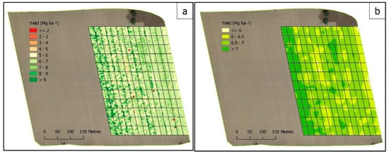 The yield map used for the quantitative analysis is shown in Figure 6a, while the generalized version used only for visual analysis purposes is shown in Figure 6b. The three treatments did not differ significantly for total yield (Table 2) and no relationship was found between the N rate and yield (R2 = 0.087). Similarly, no correlation was found between N treatments and protein content (R2 = 0.001). However, the slight difference in protein content observed between Flat-N and Var-N-low (Table 2) was statistically significant (p = 0.02) even though it was not agronomically relevant. Finally, grain yield was weakly correlated to NDVI at any time of NDVI measurements (Table 3).