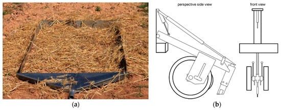 (a) Details of straw mulch application on an experimental erosion plot, Canals, Valencia (Photo: A. Cerdá). (b) Direct drill stump jump seeder adapted from patent EP0506661B1 filed in 1990.