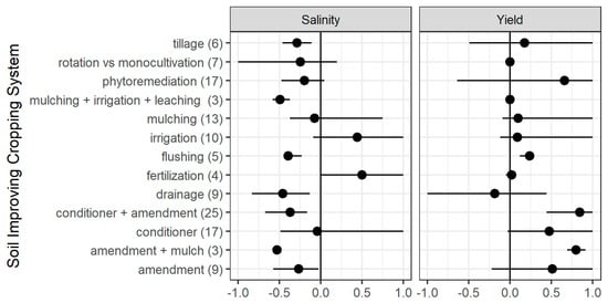 Effect size of different soil improving cropping systems for reported data on soil salinity and corresponding reported crop yields from the studies mentioned in Table 1.
