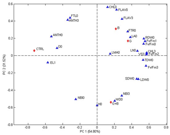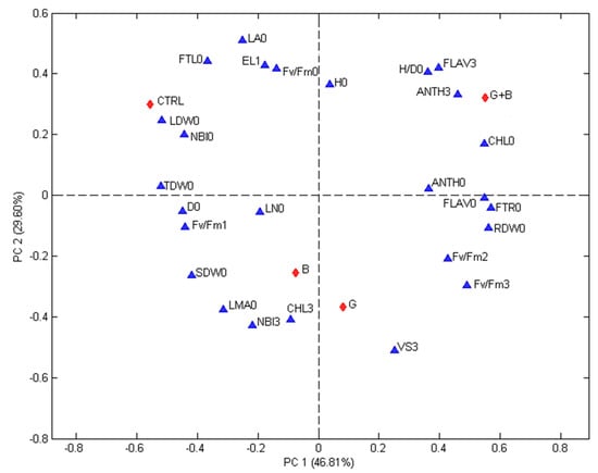 The studied parameter (blue triangles) are: H/D = height to diameter ratio, CHL = index of the chlorophyll content in leaf measured using a DUALX instrument, FLAV = index of the flavonoid content in leaf measured using a DUALX instrument, ANTH = index of the anthocyanin content in leaf measured using a DUALX instrument, NBI = nitrogen balance index, LN (no.) = number of leaves per seedling, LA = leaf area, LDW = leaf dry weight, SDW = stem dry weight, RDW = root dry weight, TDW = total dry weight, FTL = fraction of total dry weight to leaves, FTR = fraction of total dray weight to roots, LMA = leaf mass area, Fv/Fm = photochemical efficiency of photosystem II (PSII), EL = electrolyte leakage, VS 3 = VS 15 days = the visual score recorded, 0 = measured or recorded before stress, 1 = measured or recorded immediately after the stress, 2 = measured or recorded 24 h after the end of the stress, 3 = measured or recorded at regrowth (15 days after stress). The studied treatments (red diamonds) are: CTRL = seedlings without microorganism treatment, G = seedlings inoculated with Funneliformis mosseae, B = seedlings inoculated with Paraburkholderia graminis, and G + B = seedlings inoculated with Funneliformis mosseae + Paraburkholderia graminis.