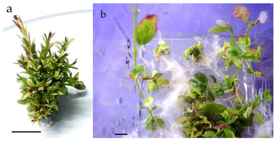 Proliferation of the caper in 0.6 mg·L−1 of mT (a) and rooting in the MS IAA2 medium (b); bar = 1 cm.