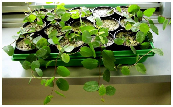 It is well documented that the species from the Capparaceae family have great morphogenic potential, but most micropropagation studies were conducted on Capparis spinosa L. [5,18,19,33] or Capparis decidua [20,24]. Hegazi et al. [22] reported on the micropropagation of two Capparis species from Egypt, C. orientalis and Capparis leucophylla. In this investigation, C. orientalis produced up to 9 axillary shoots/explants after 6 weeks in the culture on MS medium supplemented with 3 mg mg·L−1 of BA, and an elongation stage of an additional 8 weeks had to be performed due to very short shoots. Using a somewhat prolonged multiplication stage of 50 days, we managed to produce a much higher number of shoots/explants at a low cytokinin (mT or BAP) concentration, and these shoots were long enough to be transferred directly to the rooting medium. Proliferation in the medium supplemented with 0.6 mg·L−1 ZEA (Table 2) as a natural cytokinin was not effective as reported by Chalak and Elbitar [18], who found the best proliferation rate of C. spinosa L. subsp. rupestris in the medium supplemented with 1 mg·L−1 of ZEA.